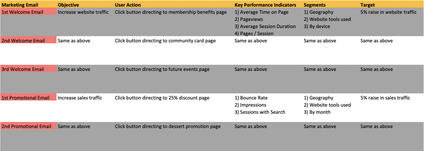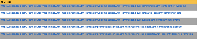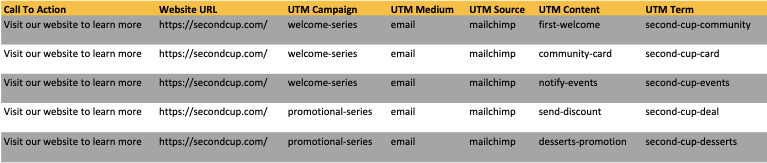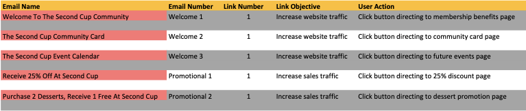 Outcome: In theory, these documents would help Second Cup know what to measure when these email campaigns are in action (from a success standpoint), as well as keep an organized log of the campaigns and their associated UTM components